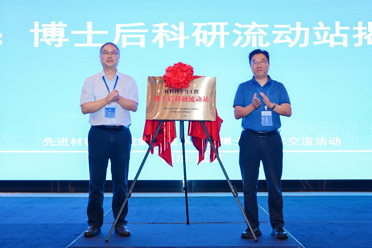 开幕式会议第三项议程,举行西南交通大学材料科学与工程博士后科研流动站揭牌仪式。由晏启祥与陈辉共同为流动站揭牌,标志着西南交通大学材料学科在高层次人才培养平台建设上迈出了坚实一步,将为材料学科建设和国家重大战略需求提供更有力的人才与智力支撑。