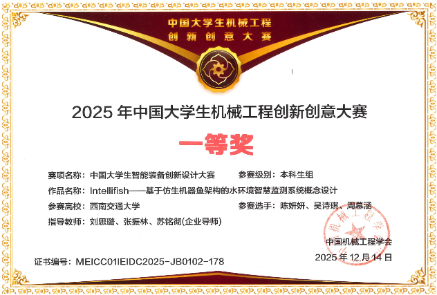 总决赛期间,经过路演专家现场考察、参赛选手现场答辩PK。我院张振林老师共同指导的作品“Intelifish--基于仿生机器鱼架构的水环境智慧监测系统概念设计”(本科生组)斩获全国一等奖。实现学院在该赛事中本科生组“零”的突破。